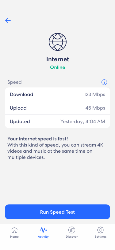 The speed test results on the dashboard of your eero app show your network’s download and upload speeds. Your download speed is a measure of how fast information is traveling from the Internet to your eero network, and your upload speed reflects the speed of traffic going in the opposite direction.