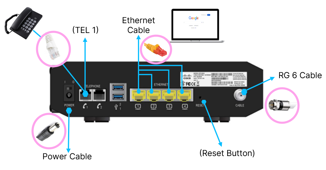 - Connect your computer and any other devices to the modem using the same Ethernet cables you were using with your old modem. You can use any of the Ethernet ports on the back of your modem (3)