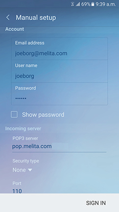 - In Incoming server type – melita.com, security type should be set to none and port to 110.