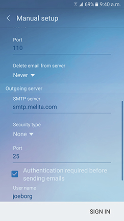 - In Outgoing server type – melita.com, security type should be set to none and port to 25.