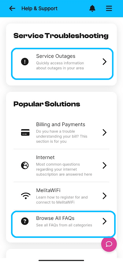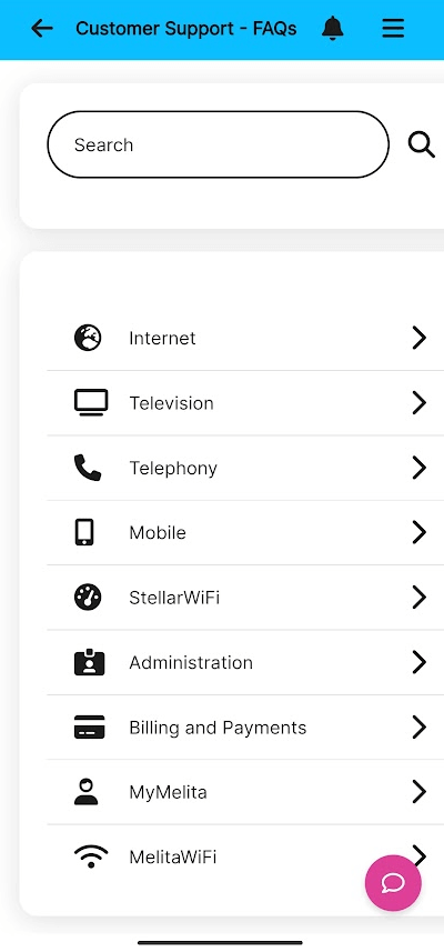 In the Popular Solutions section you will find 4 options; Billing and Payments, Internet, MelitaWIFI & Browse All FAQs.