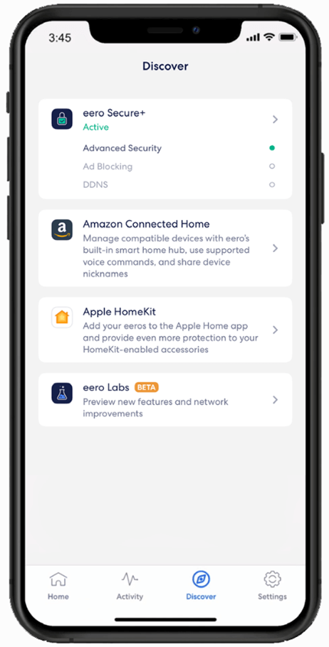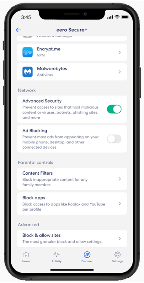Advanced SecurityAdvance network security protects all devices connected through eero from potential viruses, malware, phishing attacks, and more.Tap on eero Secure from the discover tab2. Scroll down to the Network section and toggle Advanced SecurityWas this Helpful ?YesNo