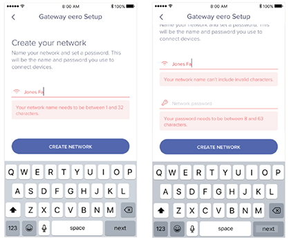 If you choose an invalid value for your network name and password during setup, you will see the below errors: