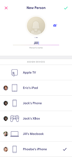 - Add a photo, enter a name and select the devices used by this person. Assigning devices to the person, allow you to monitor and manage Wi-Fi settings for that person