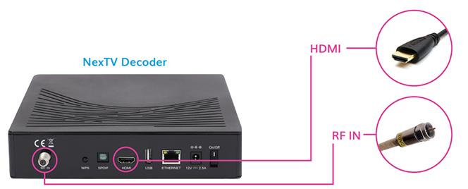 - Use the RF cable from your existing set top box and connect it to the back of the NexTV Decoder, using the socket marked RF IN