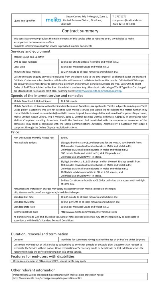 The following are the Terms and Conditions applicable in respect of the Djuno Top-up Offer, (hereinafter referred to as “the Offer”) being provided to Melita pre-paid customers (“the Customer”) by Melita Limited (“Melita”). Access to and use of the Offer is subject to the following Terms and Conditions. By accessing and using this Offer, the Customer accepts to be bound by these Terms and Conditions. For more information, please contact Customer Care on 100 (call is free) from your Melita Mobile number, or +356 77100100 from any other network.