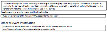 Following verification by Melita that Customer has sufficient credit, Customer shall receive a confirmation text. Default rates apply for any usage made prior to the receipt of such confirmation. The full price of the bundle shall be deducted in advance from the Customer’s credit on account. The price of the bundle is not refundable either in whole or in part.