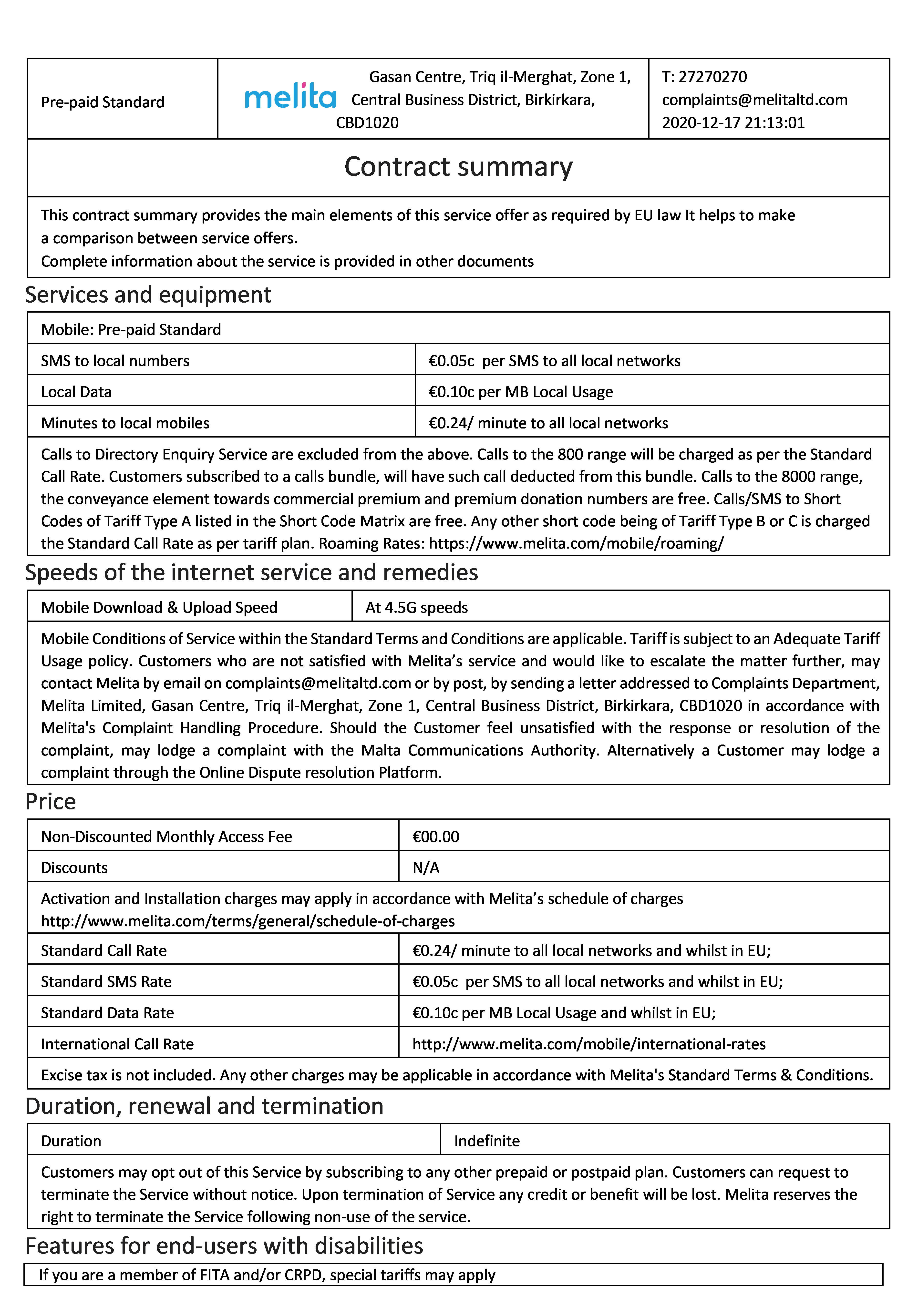 7.1 You are responsible for all charges for Services made from your SIM. Itemised billing is not available for Melita’s pre-paid service. Charges for Services shall be at the rates established by Melita, subject to lawful change at the discretion of Melita in accordance to the applicable tariff plan. Melita shall normally offer a range of tariff plans with different rates and methods of charging. Charging rates and methods may vary depending on the type of service sent or received. Melita reserves the right to cease offering and/or replace its tariff plans from time to time. Existing tariff plans may not always be available. You are advised to read the relevant Melita tariff rules and rates which are available from the Melita website at www.melita.com. You may change from one tariff plan to another subject to the tariff rules applicable thereto.